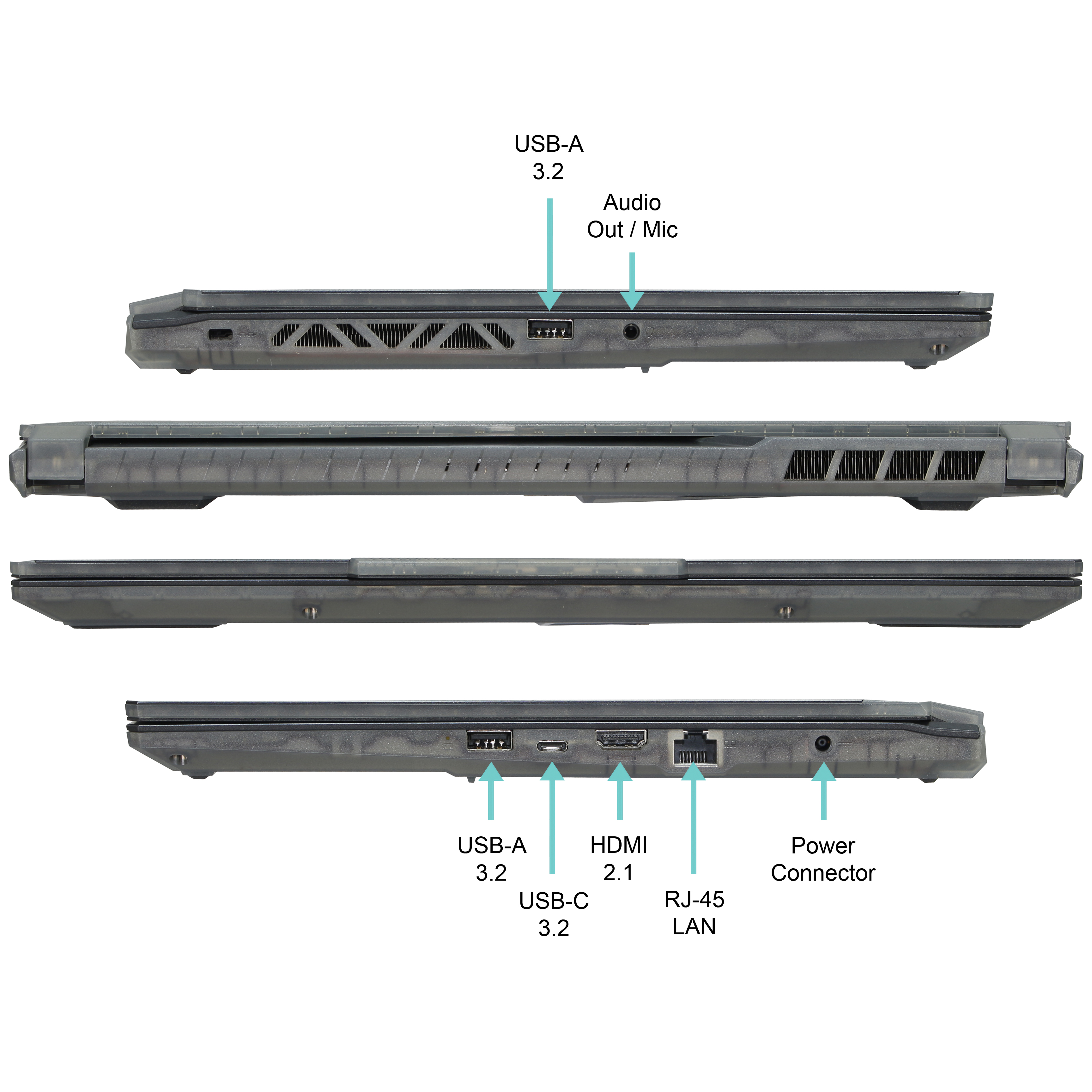 - Der Laptop ist mit einer schnellen 512GB M.2 NVMe SSD ausgestattet. Er verfügt über folgende Anschlussmöglichkeiten: USB 2.0(1x), USB 3.2(2x), USB-C 3.2(1x), HDMI Port(1x), Audio out(1x), RJ 45 Gigabit LAN Port(1x).
