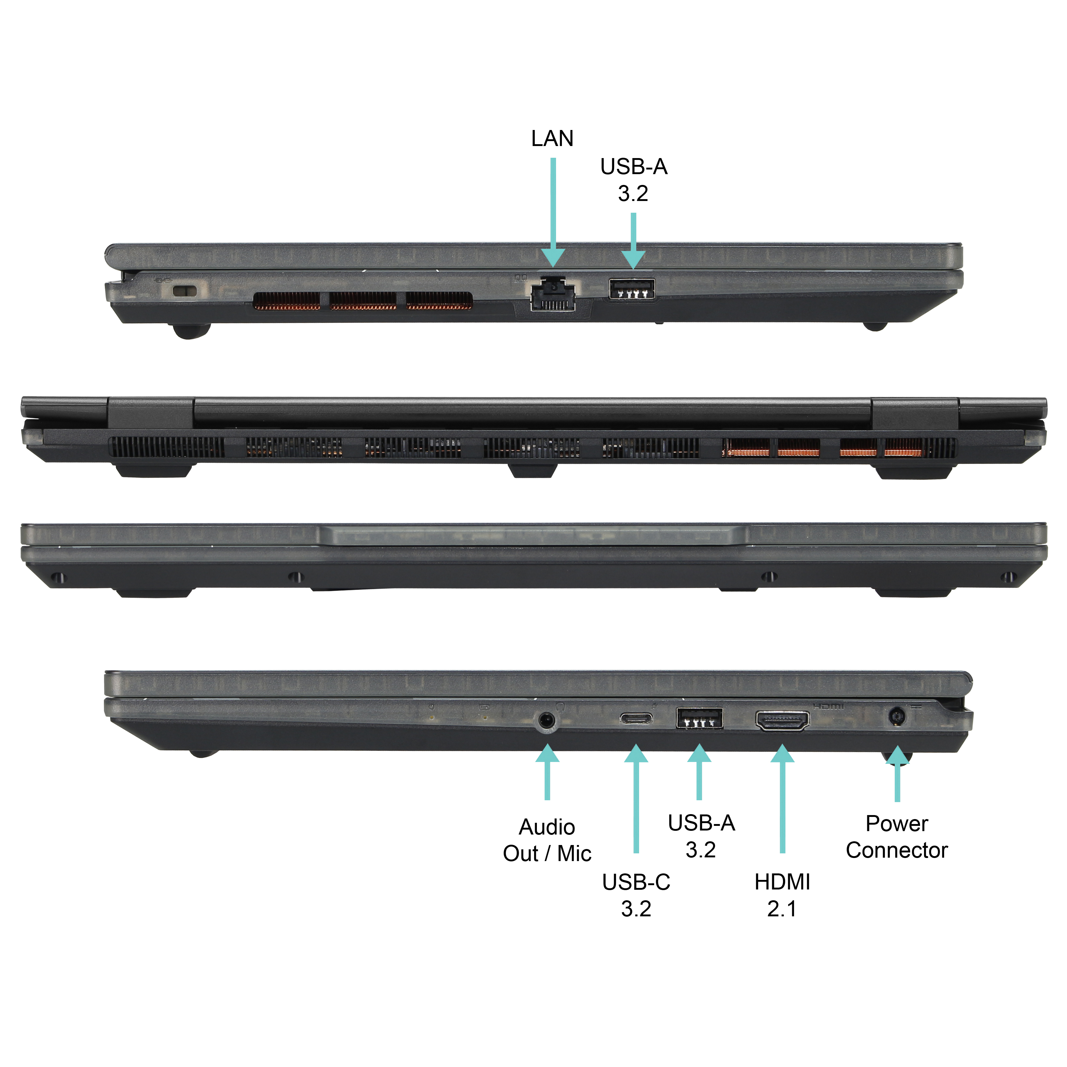 - Der Laptop ist mit einer schnellen 1000GB M.2 NVMe SSD ausgestattet. Er verfügt über folgende Anschlussmöglichkeiten: USB 2.0(1x), USB 3.2(2x), USB-C 3.2(1x), HDMI Port(1x), Audio out(1x), RJ 45 Gigabit LAN Port(1x).