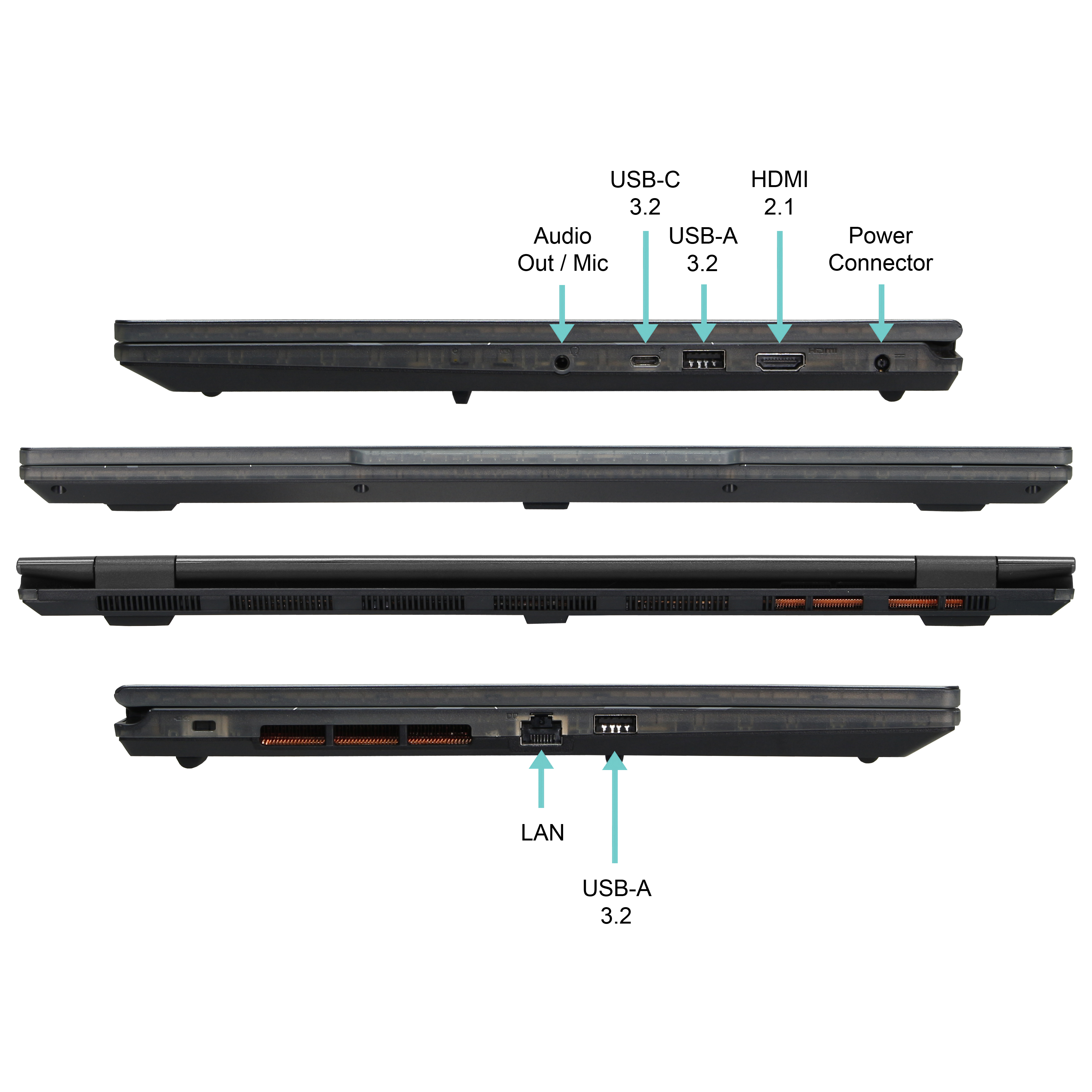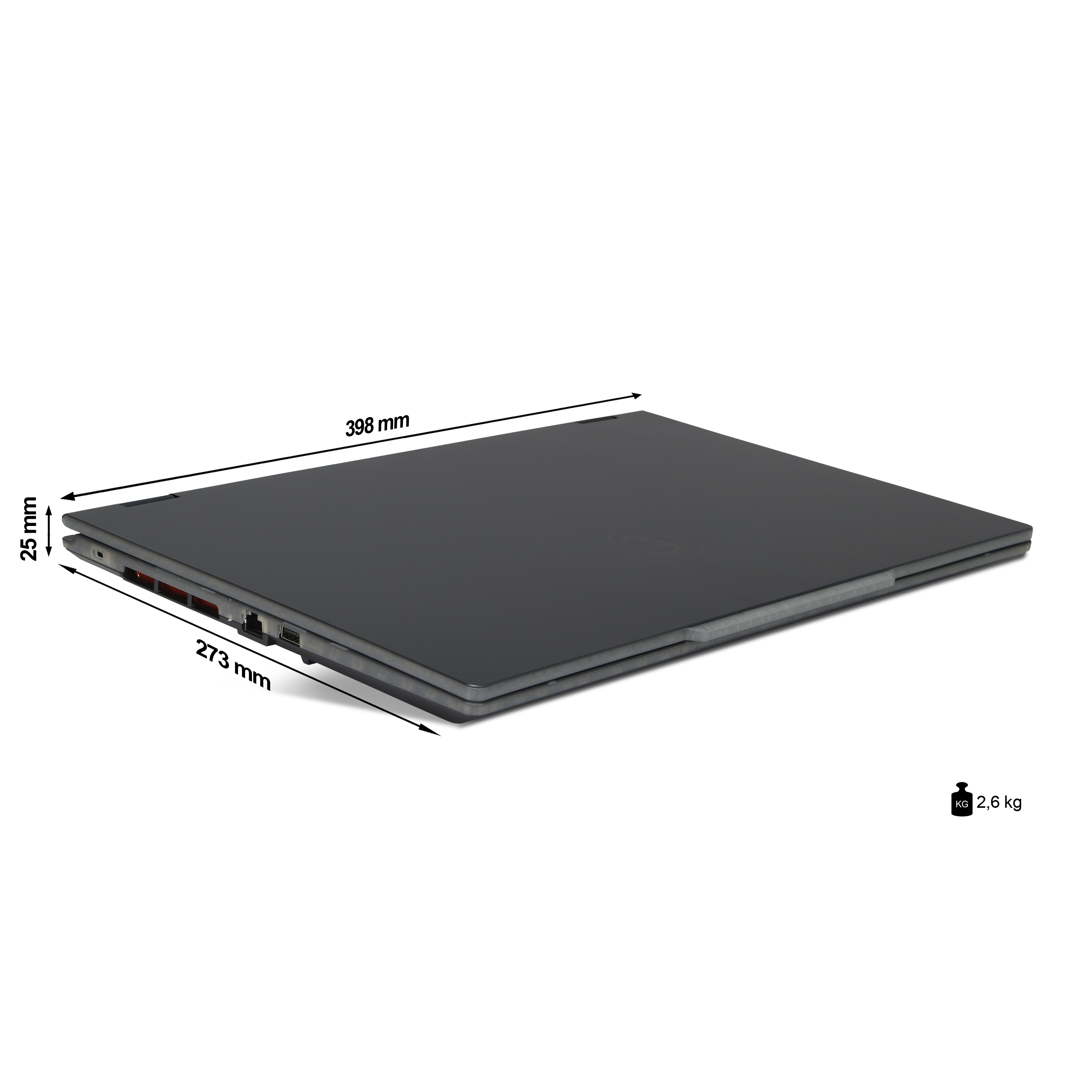 - Der Laptop ist mit einer schnellen 512GB M.2 NVMe SSD ausgestattet. Er verfügt über folgende Anschlussmöglichkeiten: USB 3.2(2x), USB-C 3.2(1x), HDMI Port(1x), Audio out(1x), RJ 45 Gigabit LAN Port(1x).
