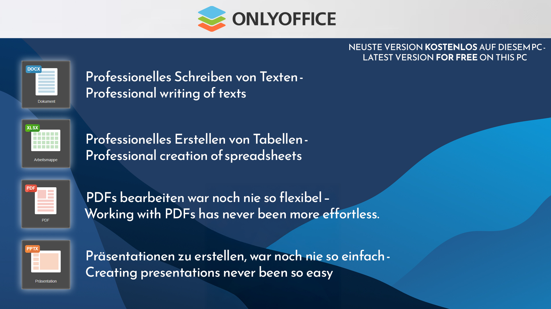 ONLYOFFICE ist eine moderne Office‑Suite für Unternehmen, Teams und private Anwender. Sie ermöglicht das Erstellen, Öffnen und Bearbeiten aller gängigen Microsoft‑Office‑Formate wie DOCX, XLSX und PPTX – vollständig kompatibel und ohne Formatierungsverlust. Neben Texten, Tabellen und Präsentationen bietet ONLYOFFICE leistungsstarke Tools für Zusammenarbeit in Echtzeit, sichere Dokumentenverwaltung und flexible Nutzung in der Cloud oder lokal. Ideal für alle, die eine zuverlässige, DSGVO‑konforme und kosteneffiziente Alternative zu klassischen Office‑Lösungen suchen.