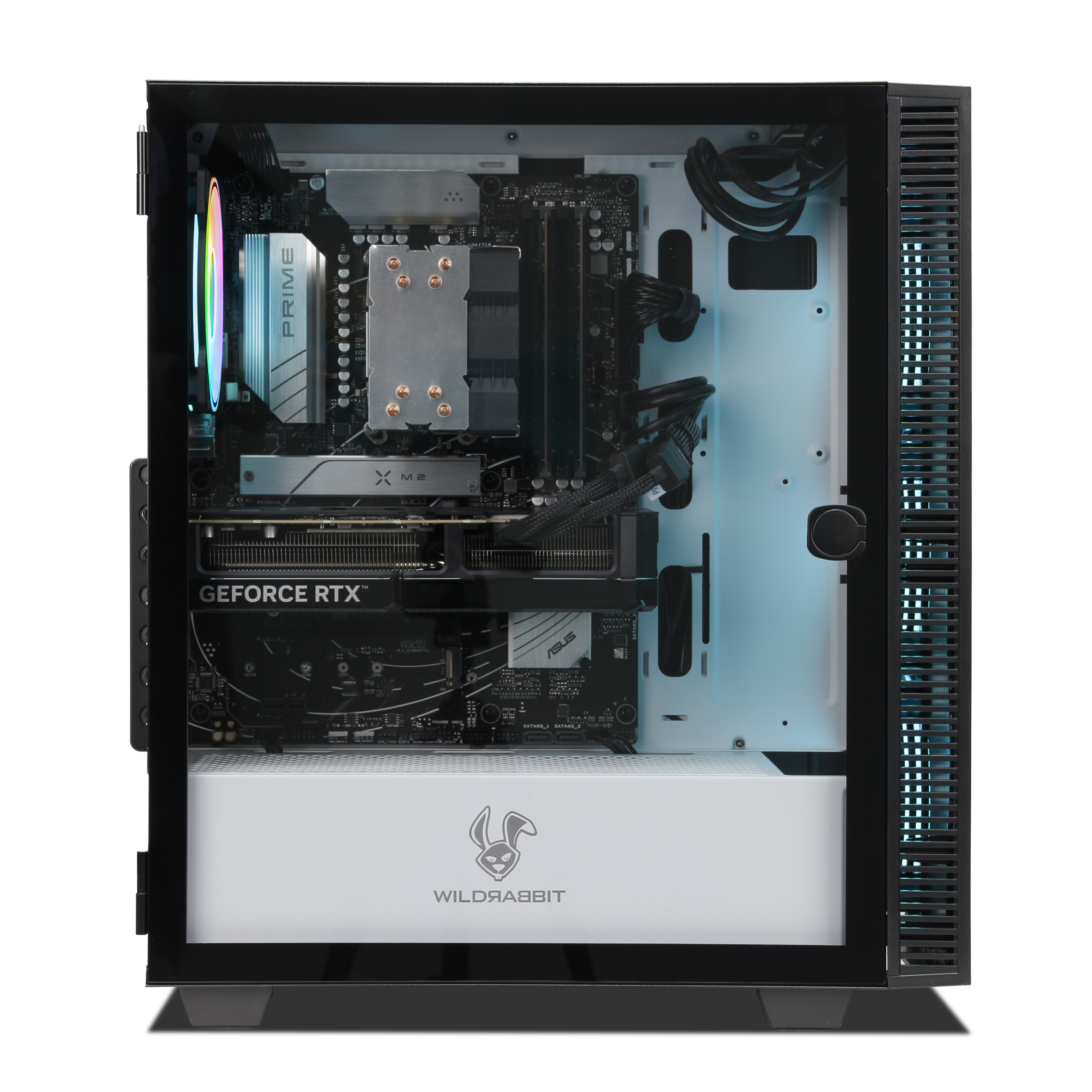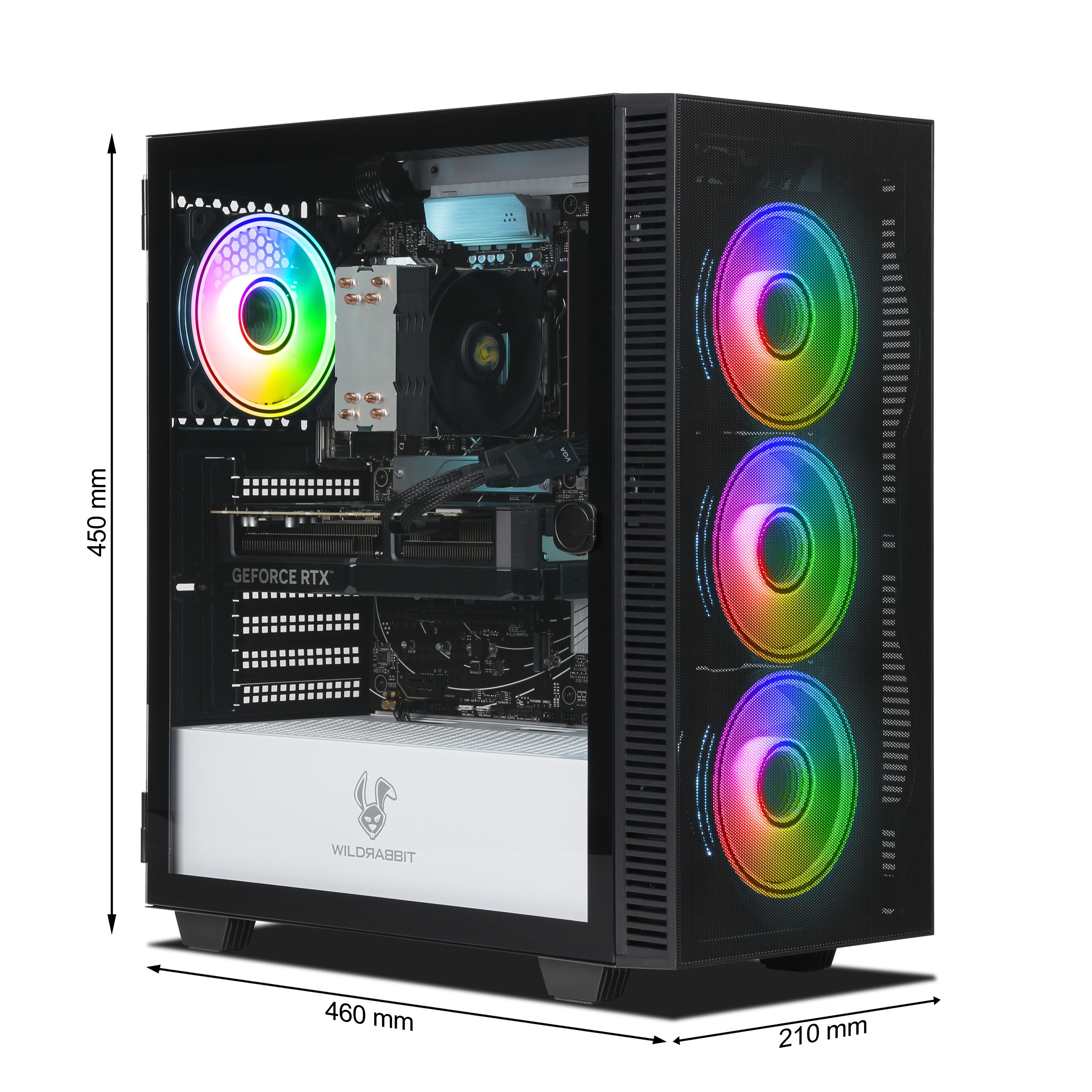 - Der PC steckt in unserem Wildrabbit Aero Gehäuse mit RGB Beleuchtung und wird von einem 750W Netzteil mit Strom versorgt. Eine WLAN & Bluetooth Lösung ist einsatzbereit und bietet umfassende Konnektivität.