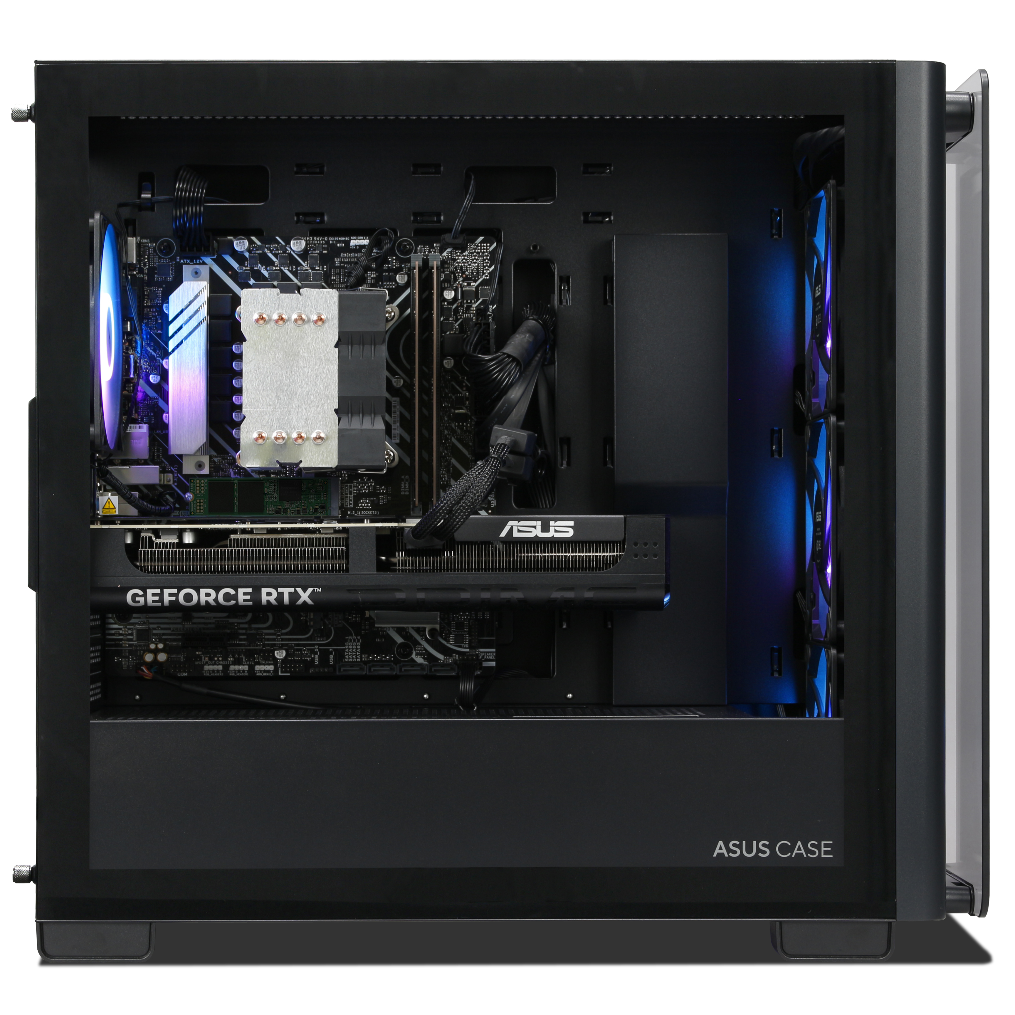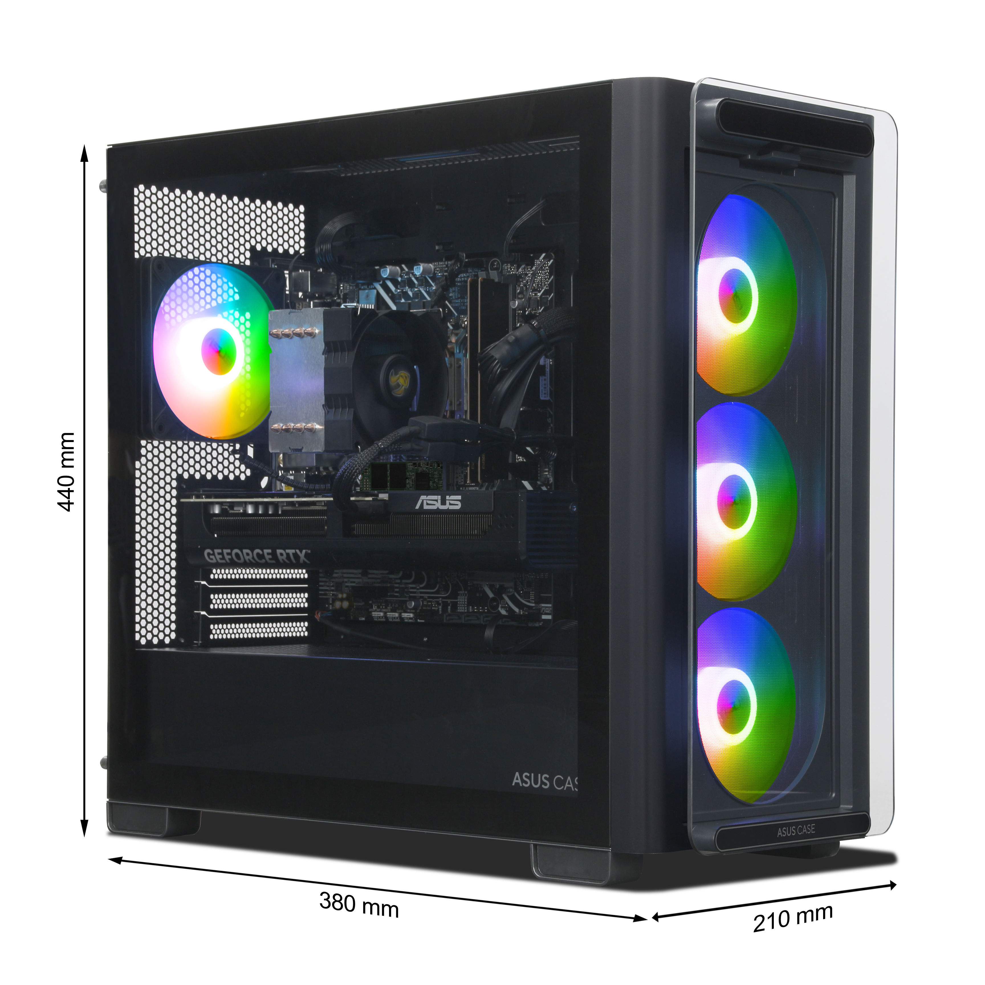 - Der PC steckt in einem ASUS A23 PLUS TG ARGB BLACK Gehäuse mit RGB Beleuchtung und wird von einem 750W Netzteil mit Strom versorgt. Eine WLAN & Bluetooth Lösung ist einsatzbereit und bietet umfassende Konnektivität.