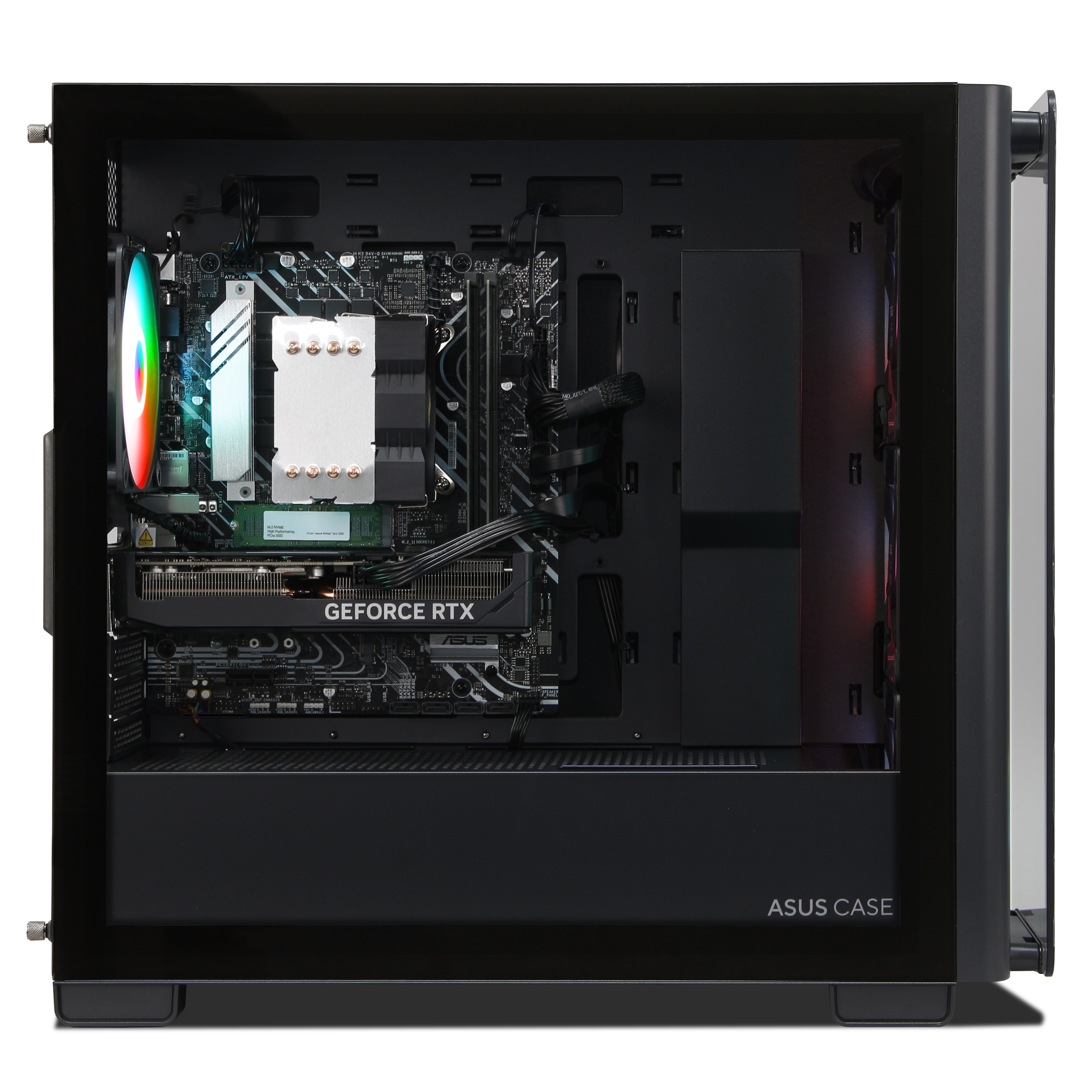 - Der PC steckt in einem ASUS A23 PLUS TG ARGB BLACK Gehäuse mit RGB Beleuchtung und wird von einem 750W Netzteil mit Strom versorgt.