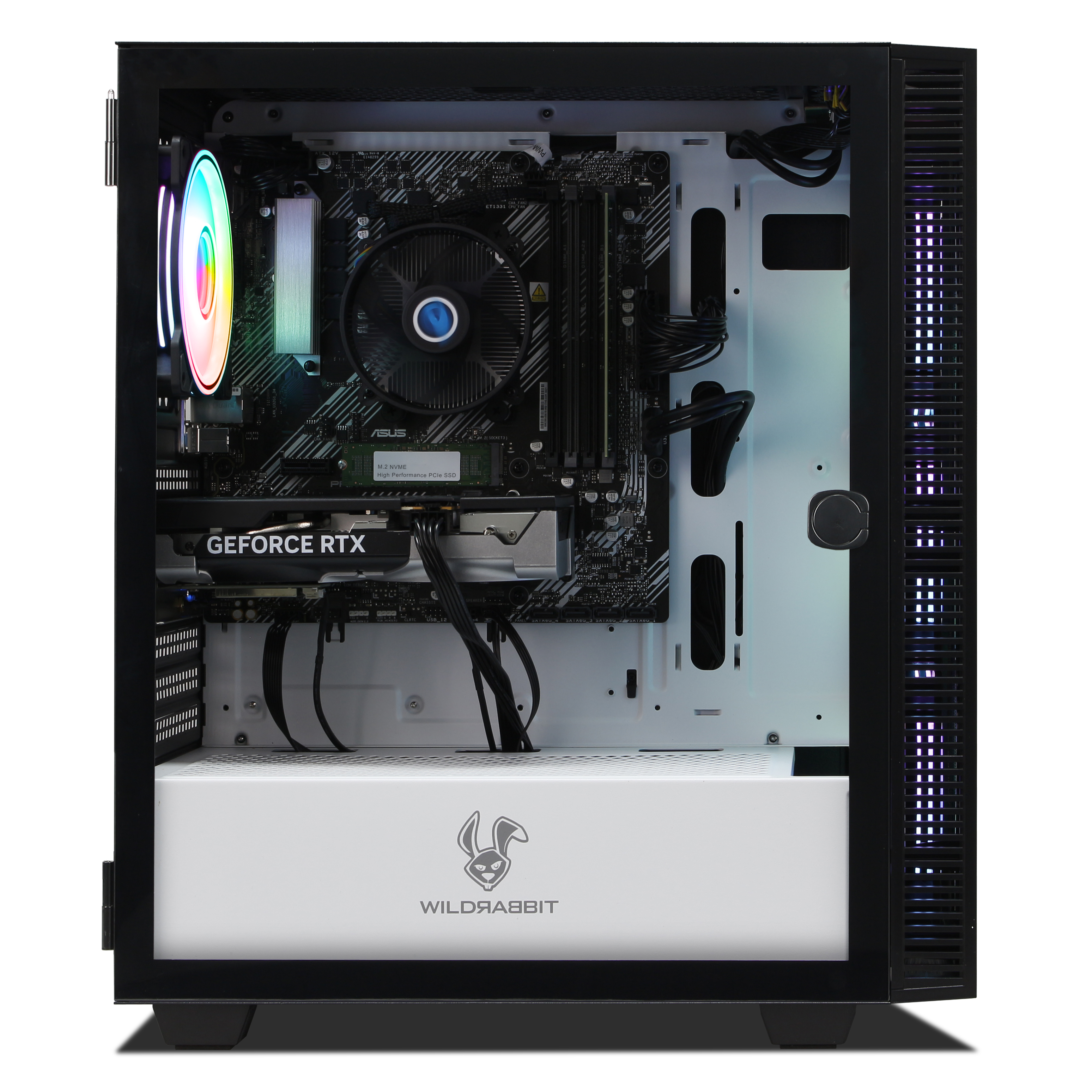 Das Gehäuse dieses PCs verfügt über eine RGB-Funktionalität, die über Tasten am Gehäuse gesteuert werden kann.