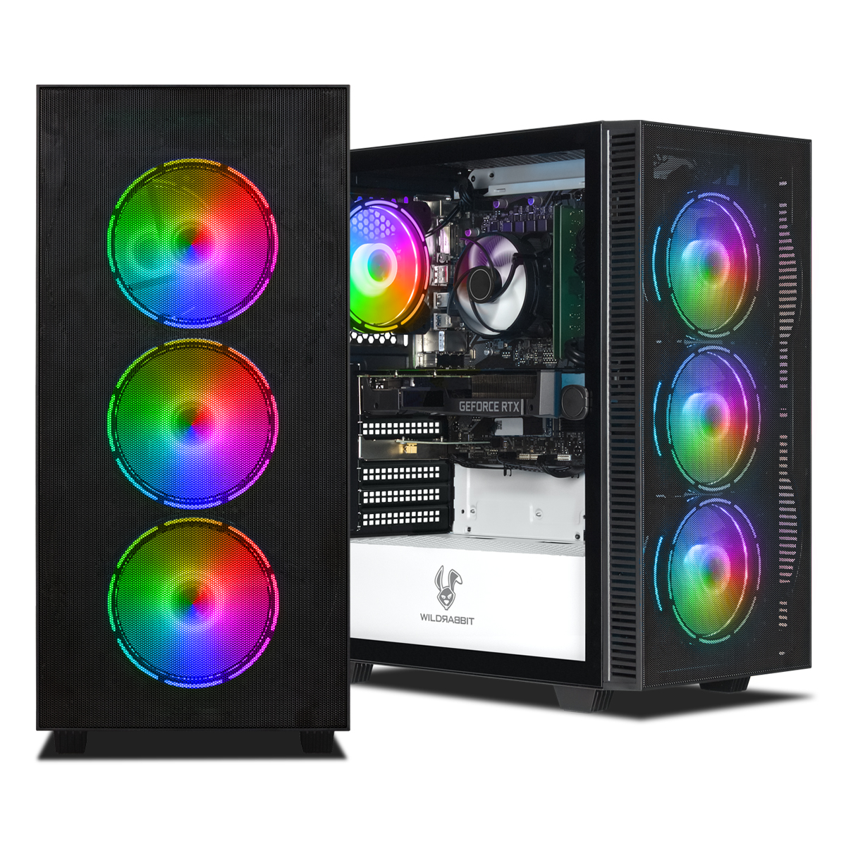- Der PC steckt in unserem Wildrabbit Aero Gehäuse mit RGB Beleuchtung und wird von einem 450W Netzteil mit Strom versorgt. Eine WLAN & Bluetooth Lösung ist einsatzbereit und bietet umfassende Konnektivität.