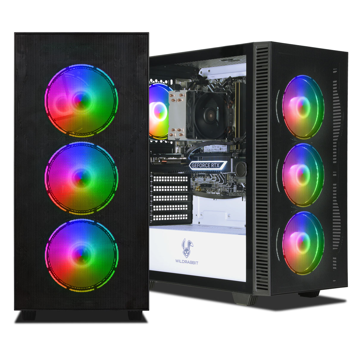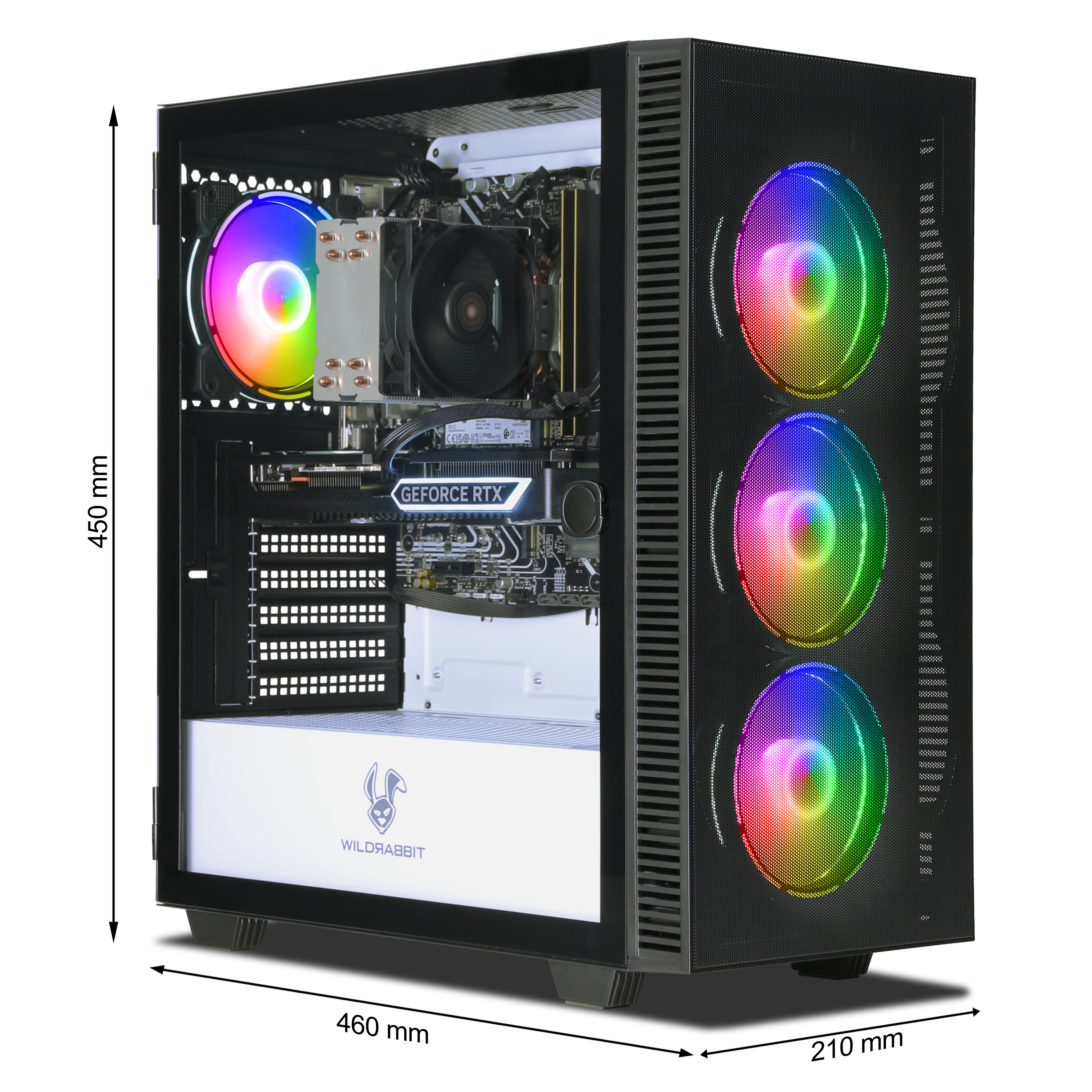 - Der PC steckt in unserem Wildrabbit Aero Gehäuse mit RGB Beleuchtung und wird von einem 750W Netzteil mit Strom versorgt. Eine WLAN & Bluetooth Lösung ist einsatzbereit und bietet umfassende Konnektivität.