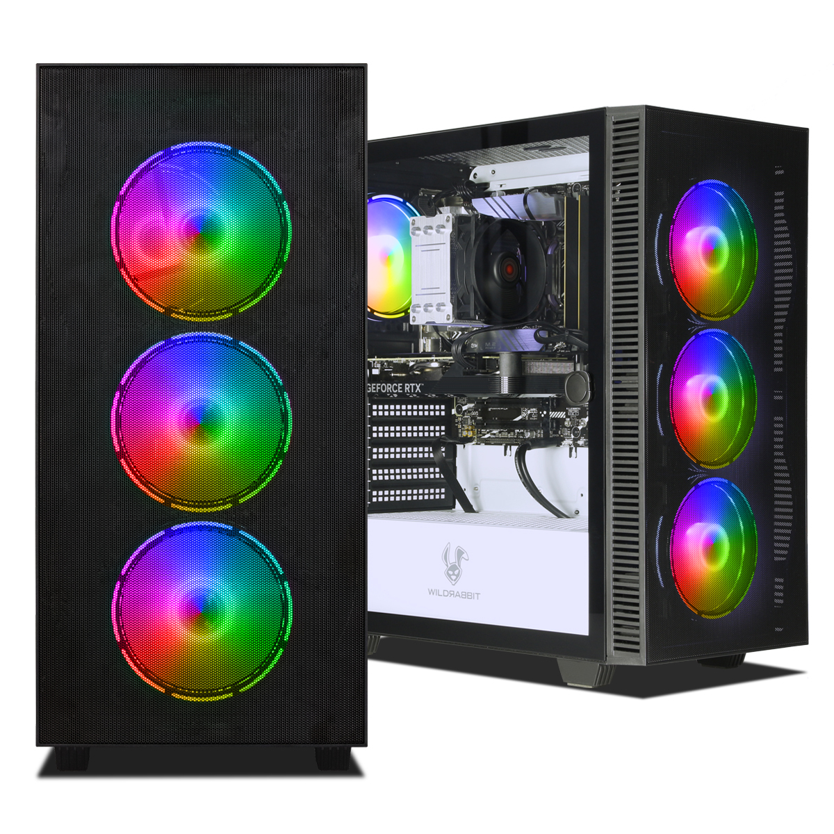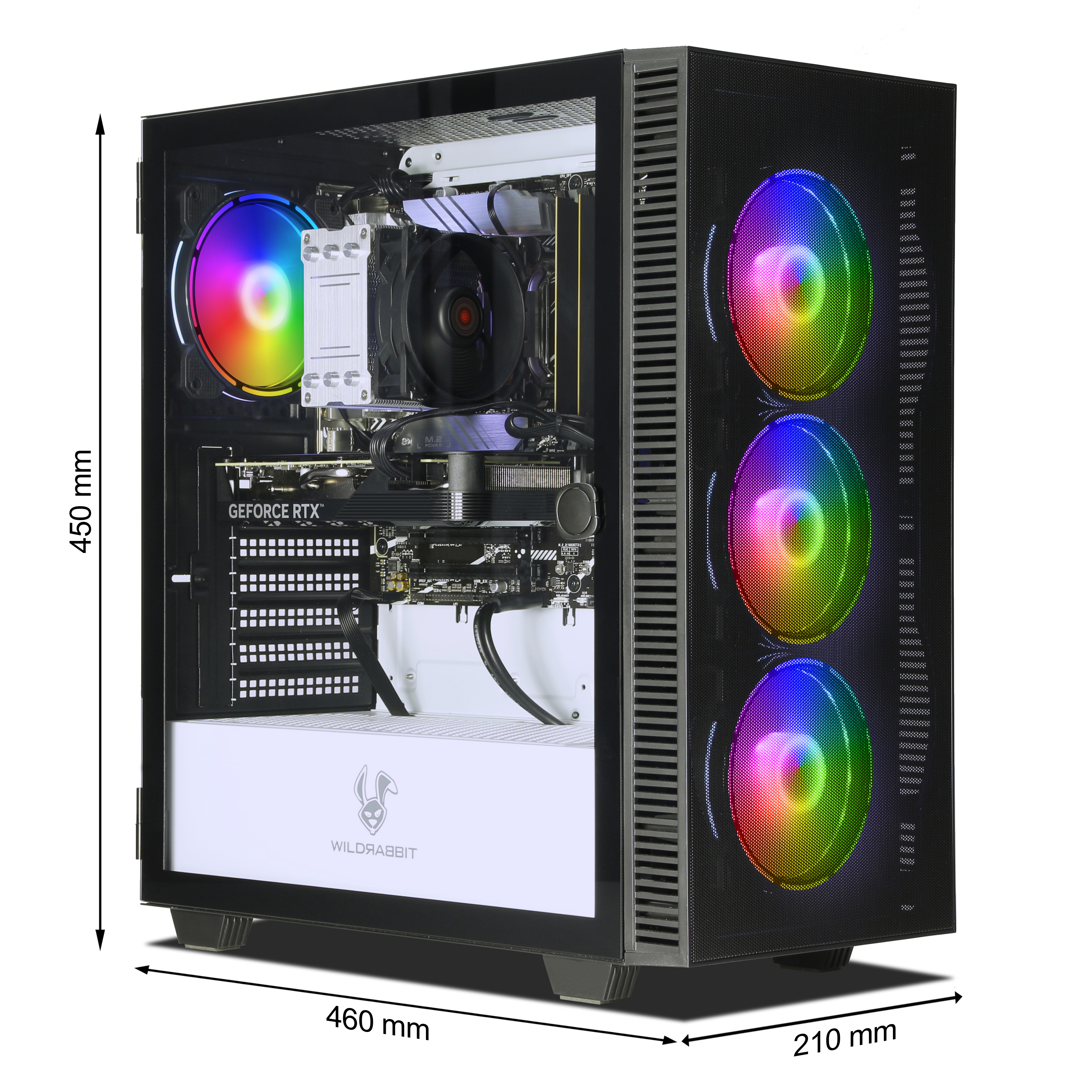 - Der PC steckt in unserem Wildrabbit Aero Gehäuse mit RGB Beleuchtung und wird von einem 750W Netzteil mit Strom versorgt. Eine WLAN & Bluetooth Lösung ist einsatzbereit und bietet umfassende Konnektivität.